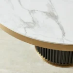 A fluted matte black pedestal base brings architectural depth while maximising legroom. Brushed brass accents frame the top and base, adding a polished contrast to the monochrome palette.