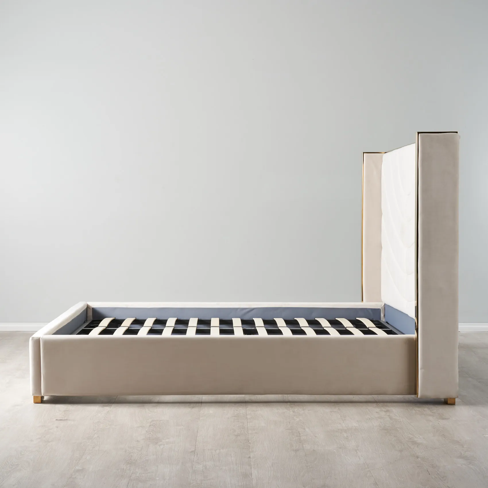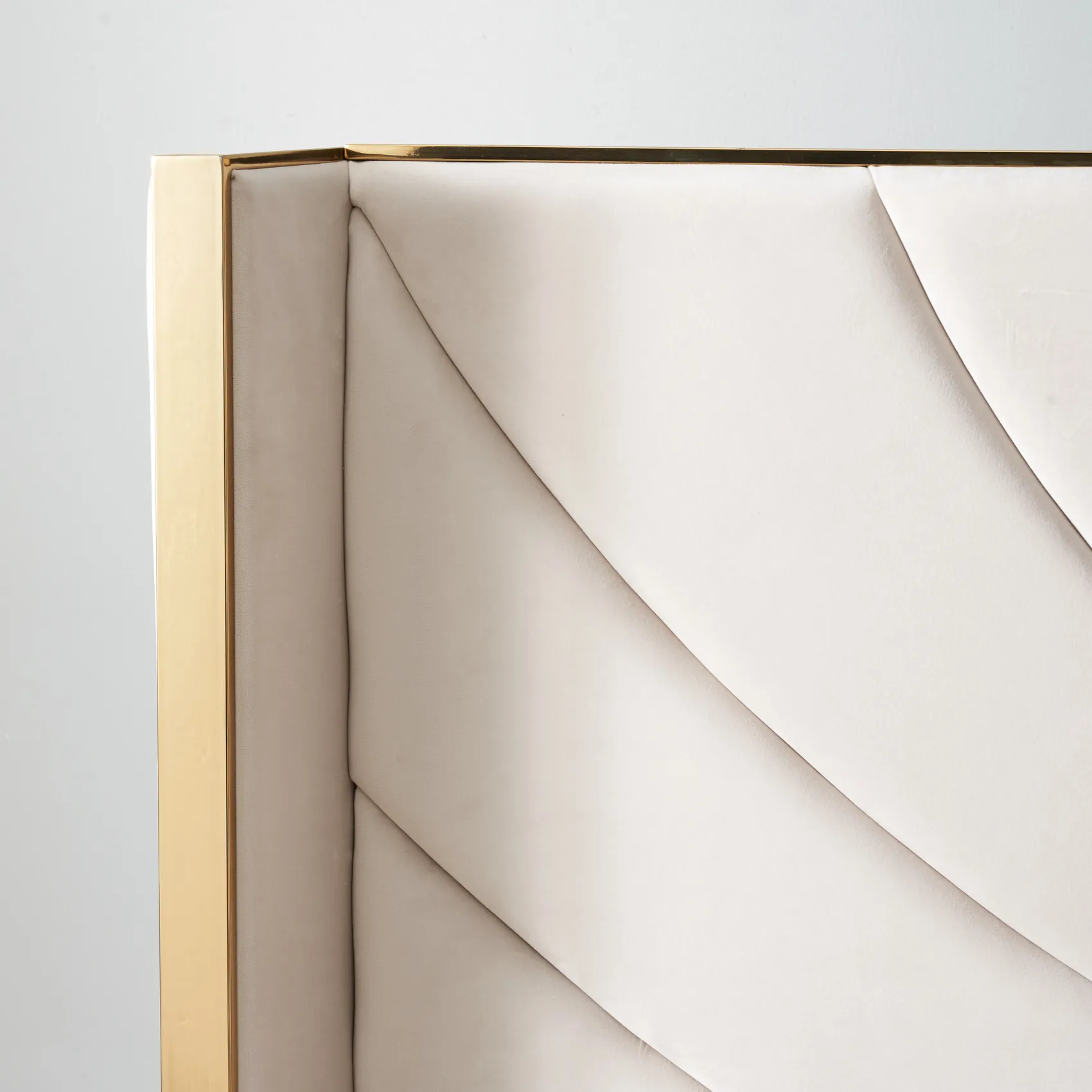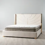 The Gertrude possesses’ qualities that will elevate your bedroom’s style to heavenly heights. This majestic piece is made from high-quality materials and features a luxurious white and gold colour scheme that fits modern or minimalistic themes. The Velvet headboard is artistically designed with elegant curves and lines reminiscent of beautiful sand art. Supporting each side of the bed are two golden frames giving the piece a chic and luxurious aesthetic. This combination of stylish design and gorgeous colours makes the Gertrude an undeniable focal point for your bedroom.