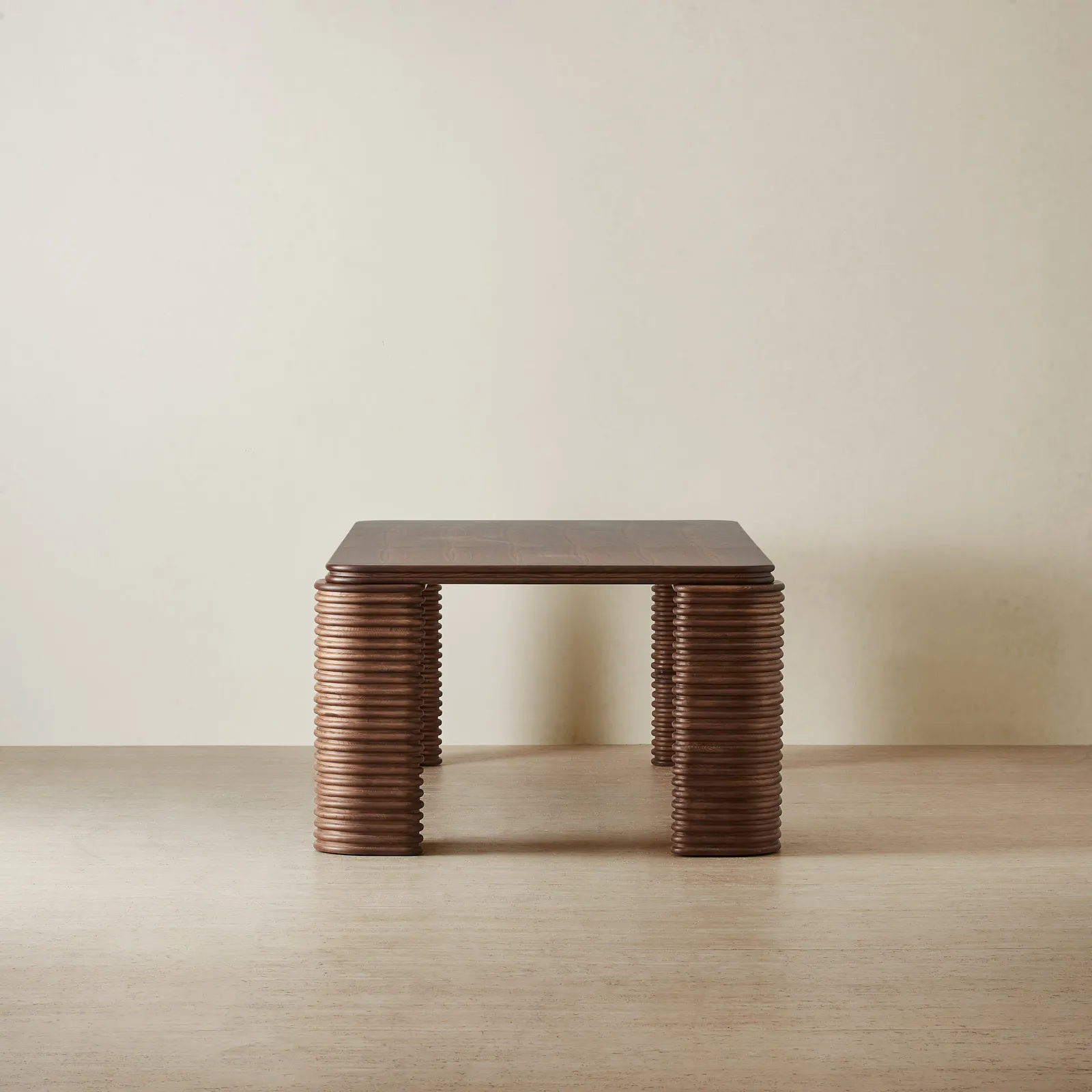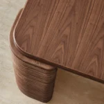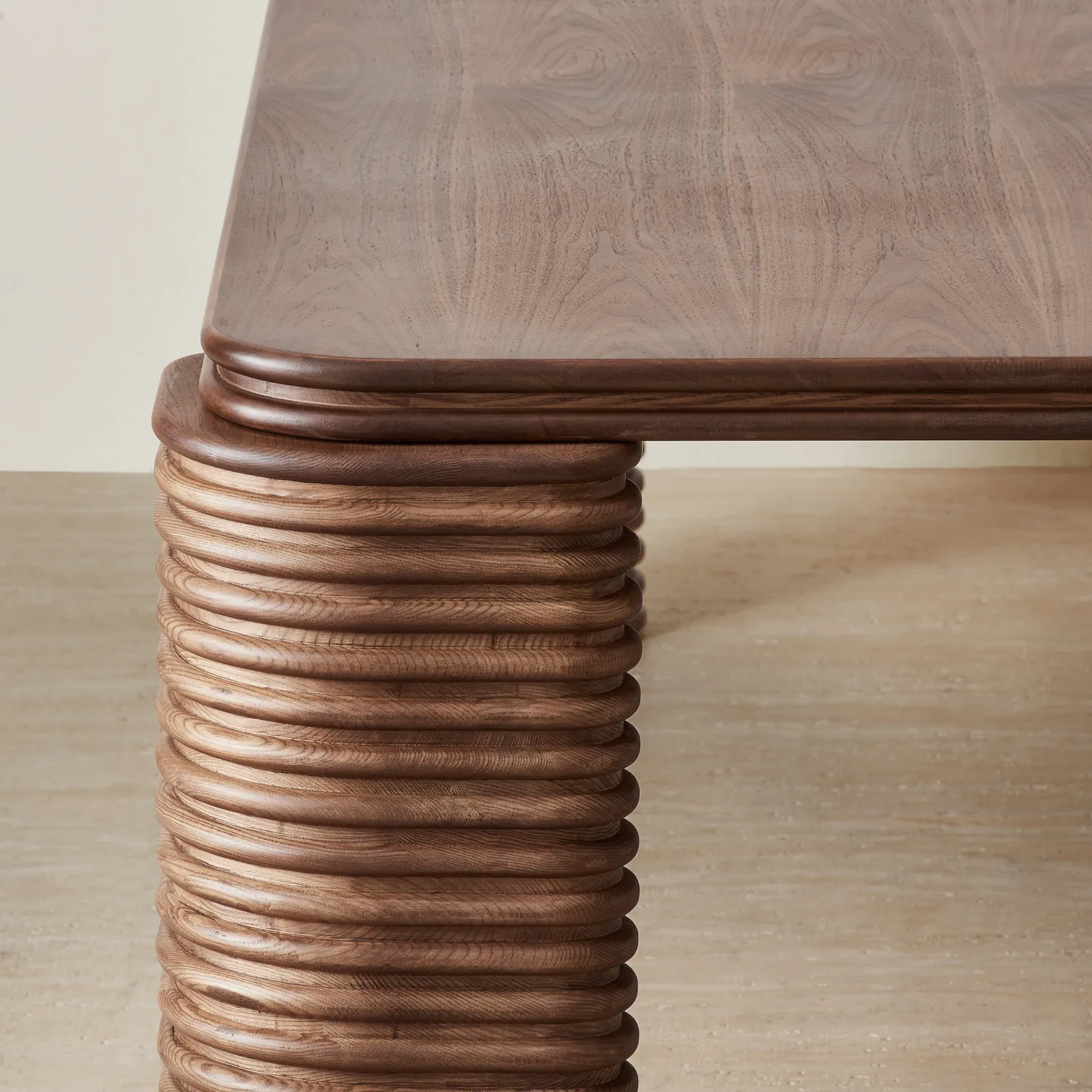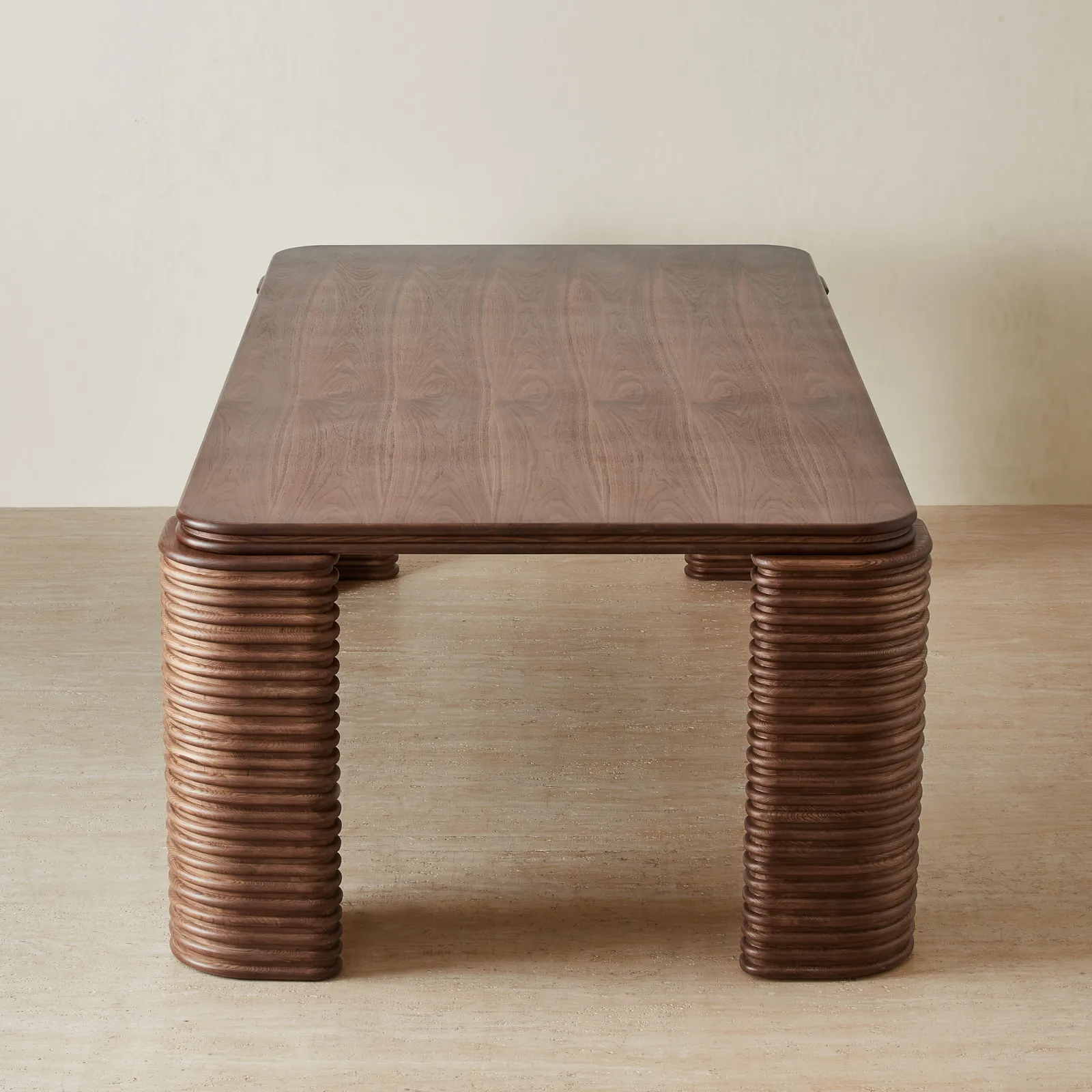 Gather around a table where design meets conversation. The Ophelia Dining Table captures attention with its mocha walnut veneer surface and thoughtfully curved edges.