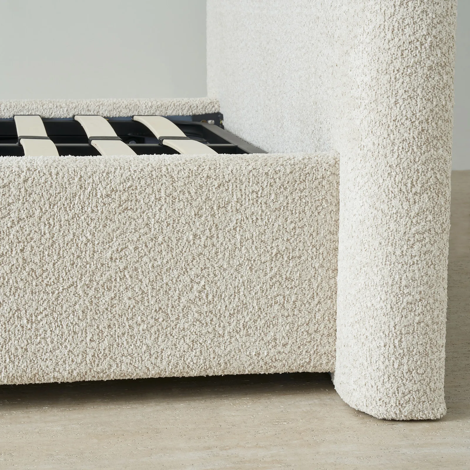 The Poppy Bed presents a sculptural form with a gently contoured headboard that suggests quiet movement. Wrapped in textured woven fabric, it offers depth and refinement.