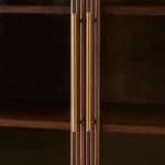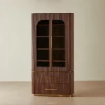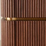 Vertical reeding adds rhythm to the design, giving the wood a rich, sculpted presence. Below, two deep drawers with brass handles provide a sleek, hidden space for everyday essentials.