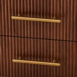The walnut veneer body boasts a rich, textured finish that exudes warmth and timeless style. Featuring three spacious drawers with sleek gold handles, it offers both practicality and modern sophistication for your bedroom.