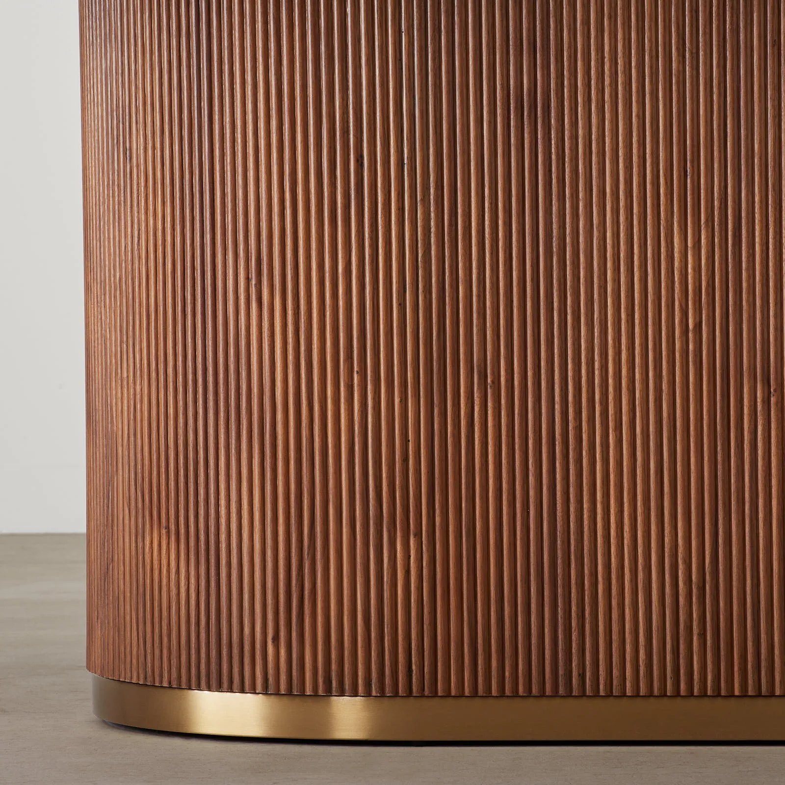 The opulent golden outline gracefully frames the table and its column, adding a regal touch that complements the rich walnut veneer. Anchored by a stately column leg with intricate vertical reeding.