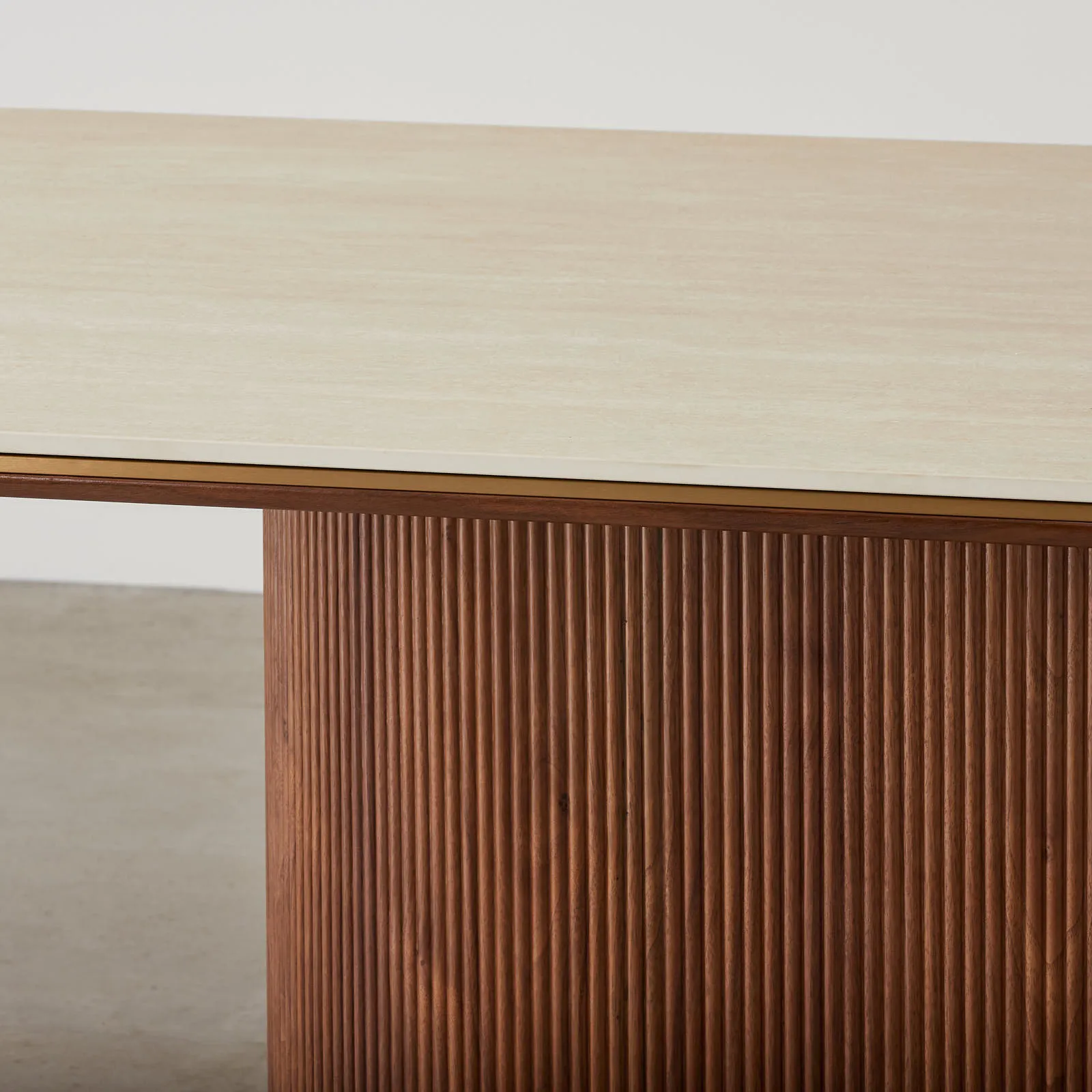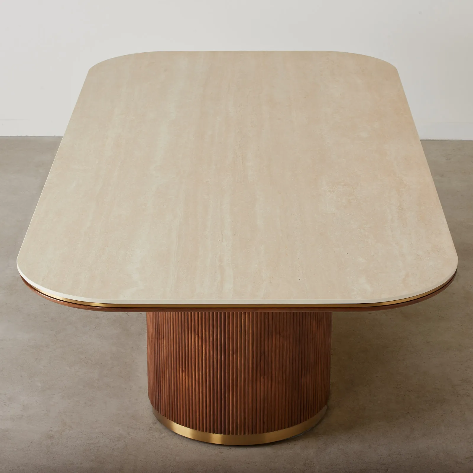 San Pierre Walnut Veneer Dining Table – Single Leg – Travertine Finish Sintered Stone Top 200x110cm