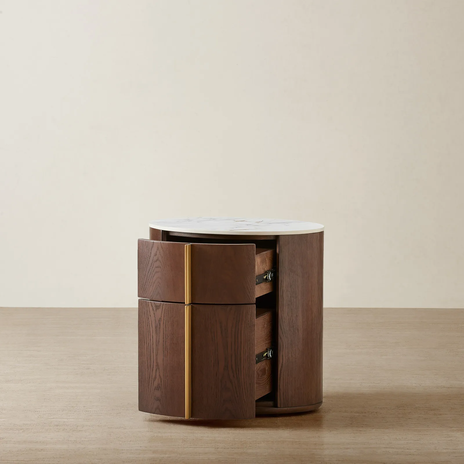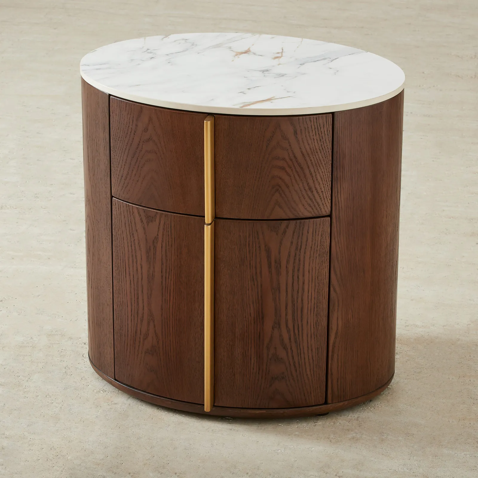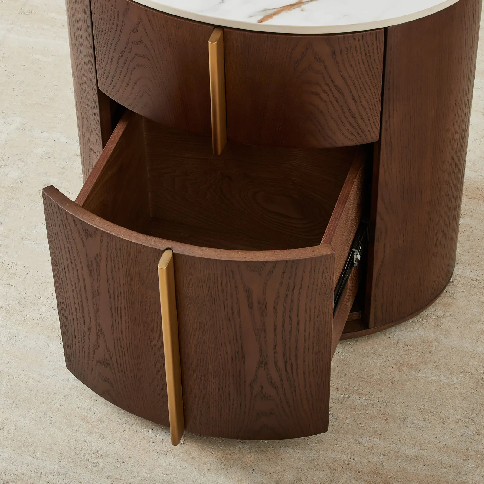 The Sir Lionell Bedside Table features a luxurious sintered stone top. Its round form adds visual softness while maximizing surface and storage space.