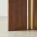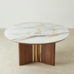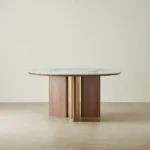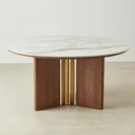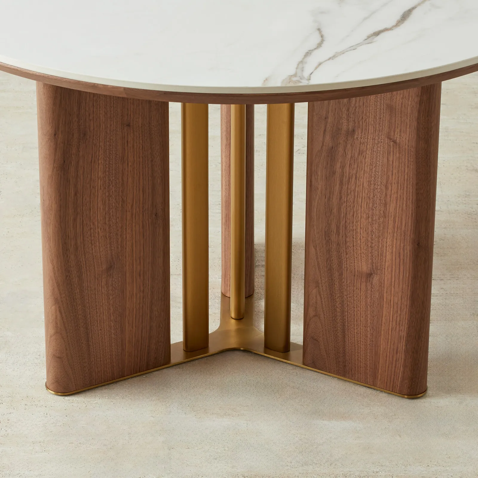 Its sculptural walnut brown wooden base, accented with gold detailing, adds a striking modern edge. Perfect for both casual dining and special occasions, blending style with functional design.