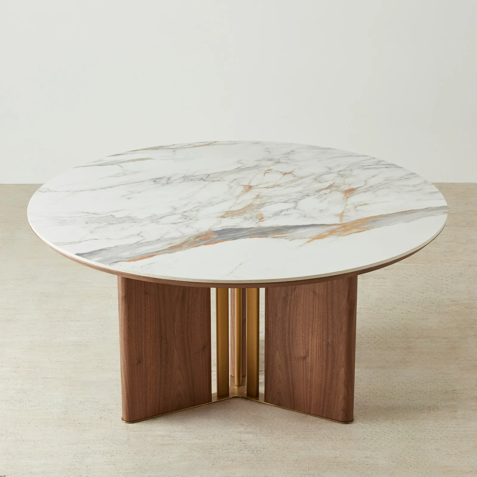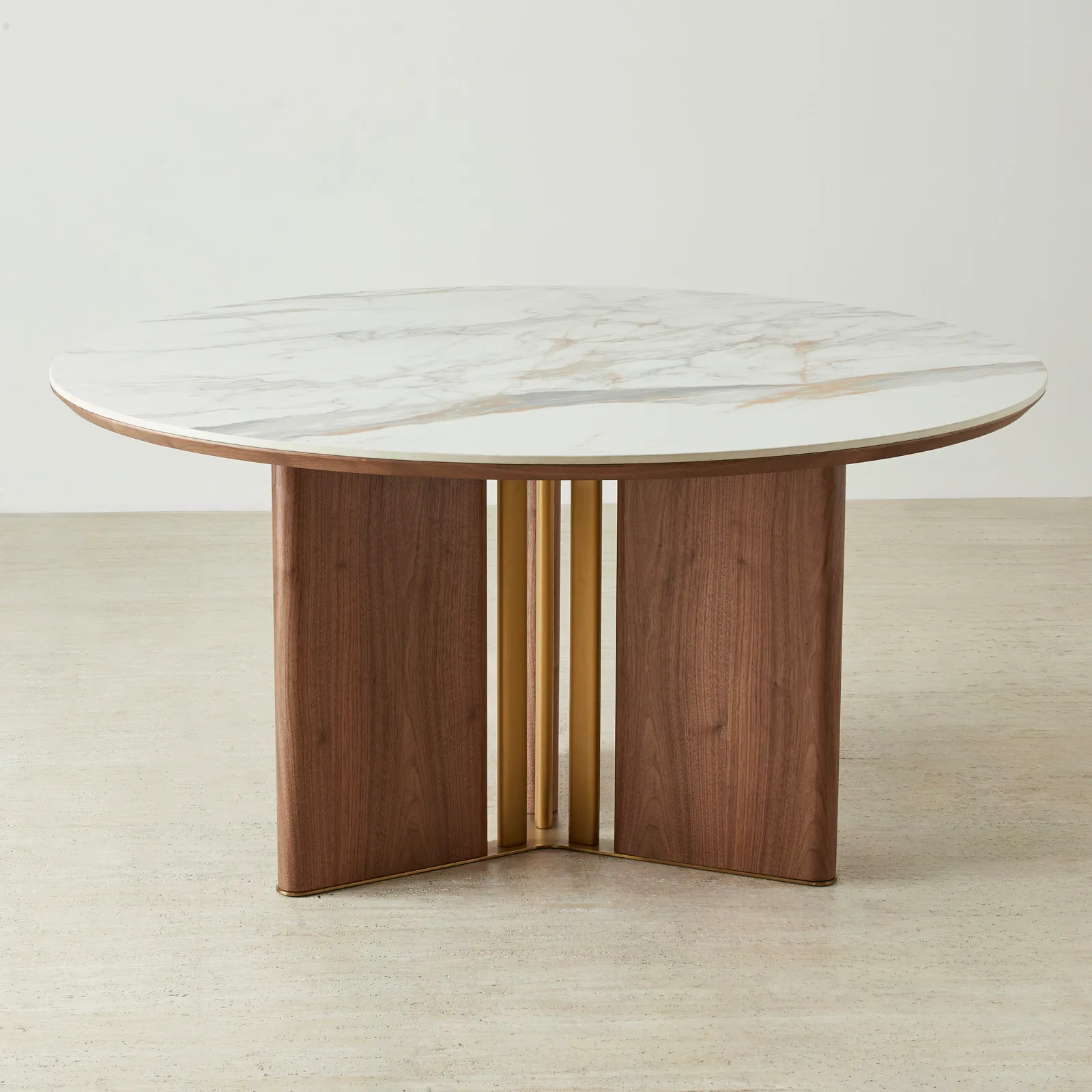 Sir Lionell II Gliding White Sintered Stone Round Dining Table – Walnut Brown Wooden Legs 150cm